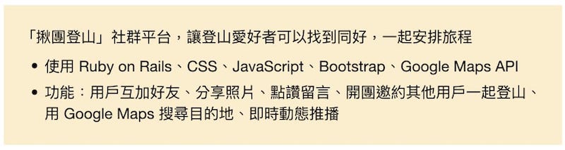 以虛構的轉職者阿蛋做出的「揪團登山」社群平台為例,他想用這個作品證明自己雖然沒有資工學位,但擁有一定的實作能力。因此,阿蛋除了附上 GitHub 連結,也在履歷中條列說明專案的重點,讓人資可以一眼就看到技能關鍵字。範例如下: