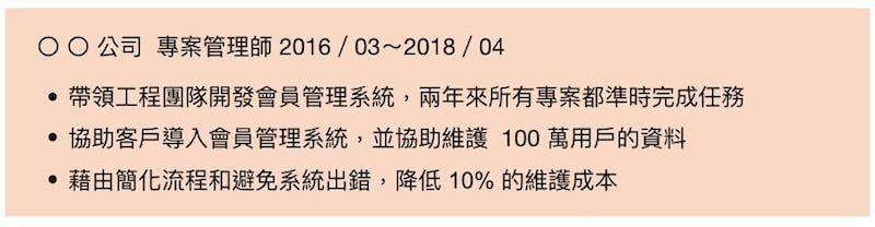 看得出來問題在哪裡嗎?以上述案例來說,這三項工作內容,本來就是所有的專案管理師的責任職掌,不用寫出來人資也知道。但雇主想知道的是你曾協助開發什麼樣的產品、時間和成本控管的成效如何等。總之,就是你在上一份工作是不是稱職的員工。